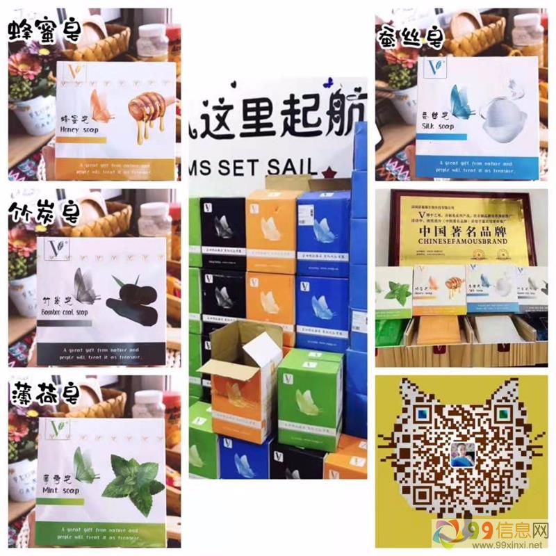我们品牌的名称V皂共有四款皂:蜂蜜皂~竹炭皂~蚕丝面膜皂~薄荷皂。